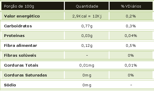 * % Valores diários com base em uma dieta de 2.000 Kcal ou 8.400kj. Seus valores diários podem ser maiores ou menores dependendo de suas necessidades.